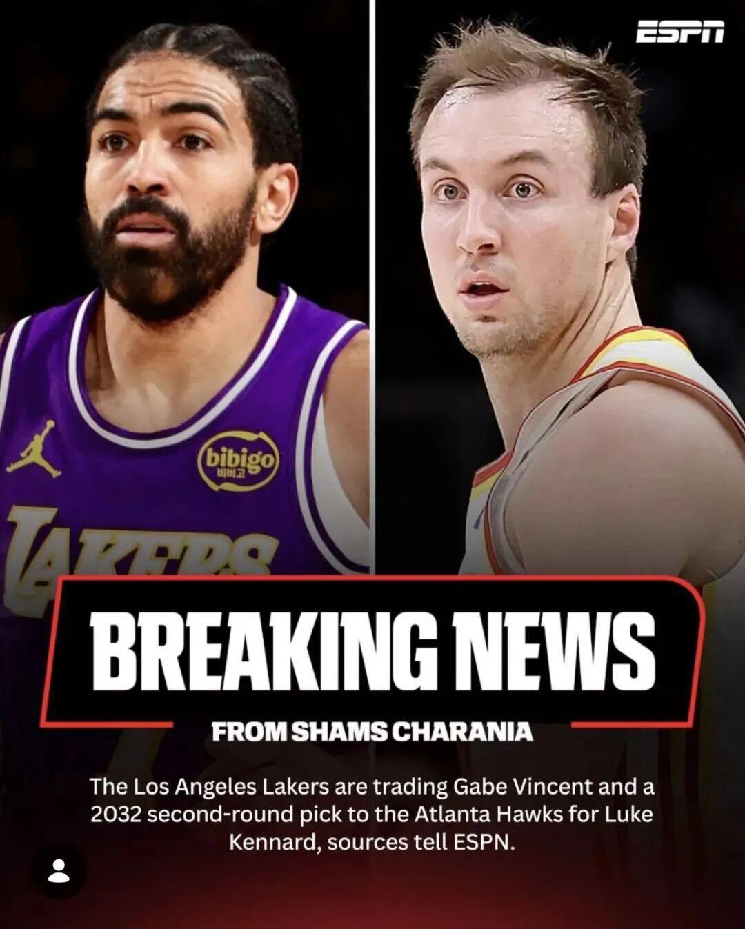 据Shams报道,湖人将盖布-文森特和一个2032年的次轮签送到老鹰,得到卢克-肯纳德。